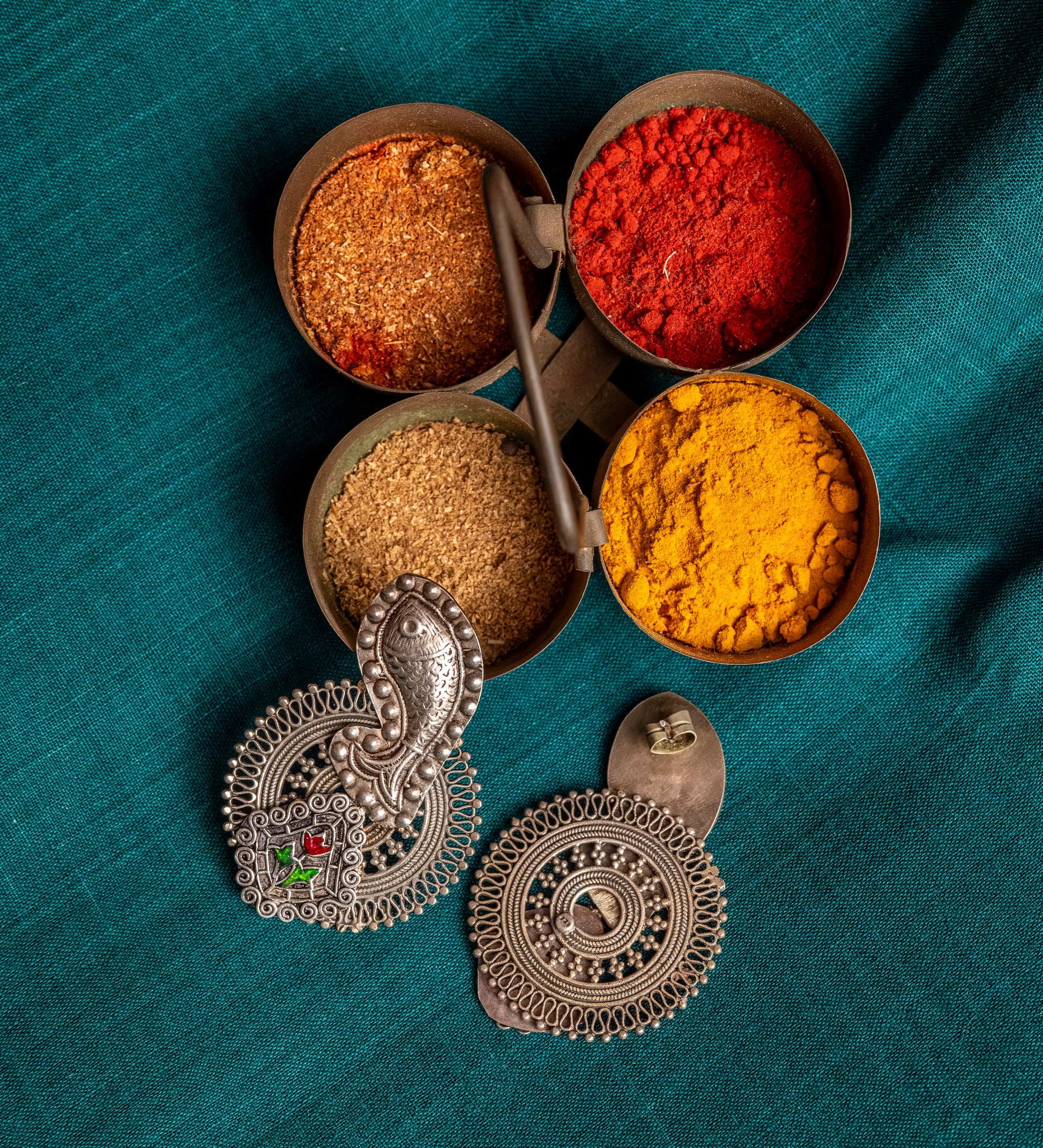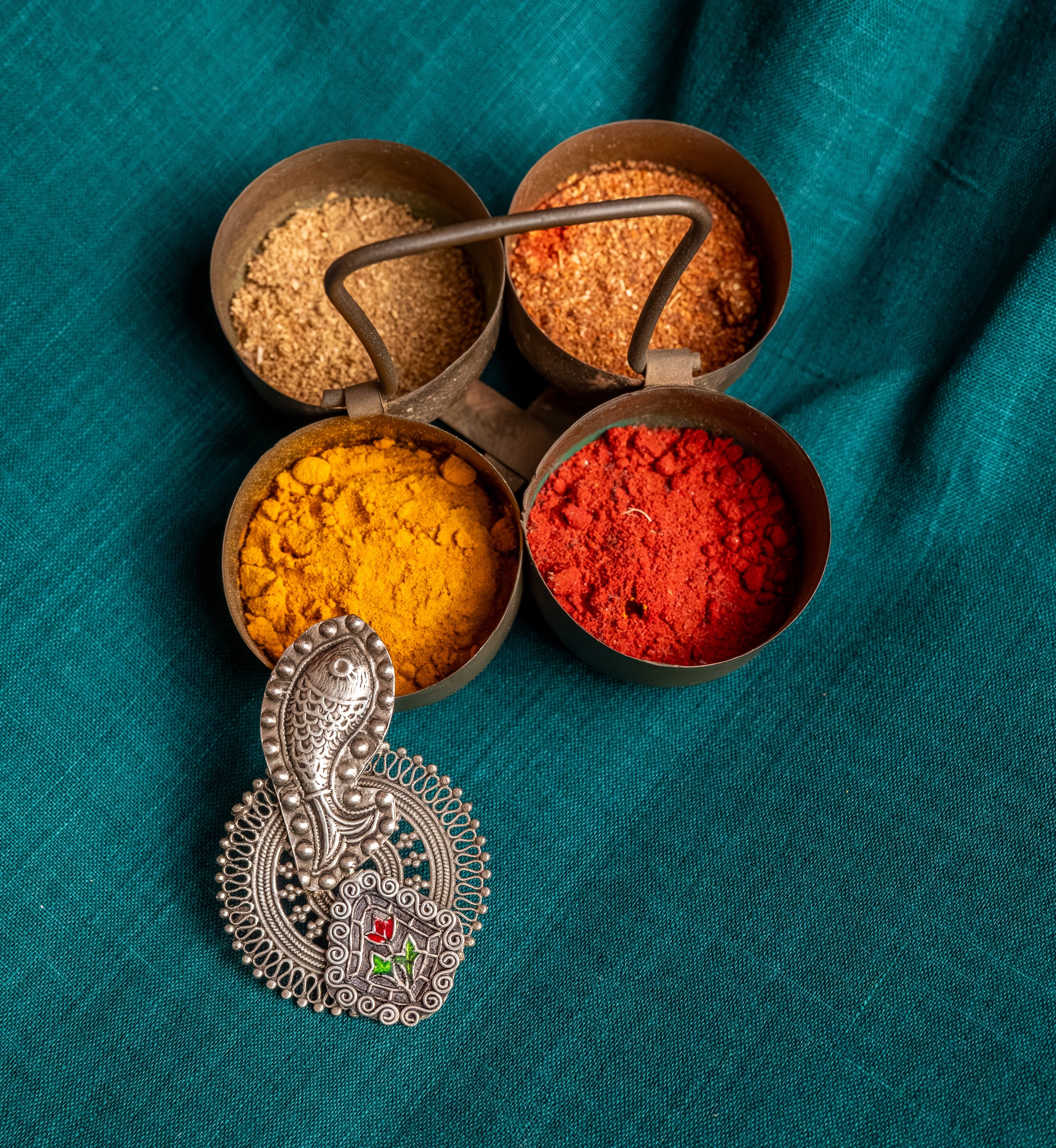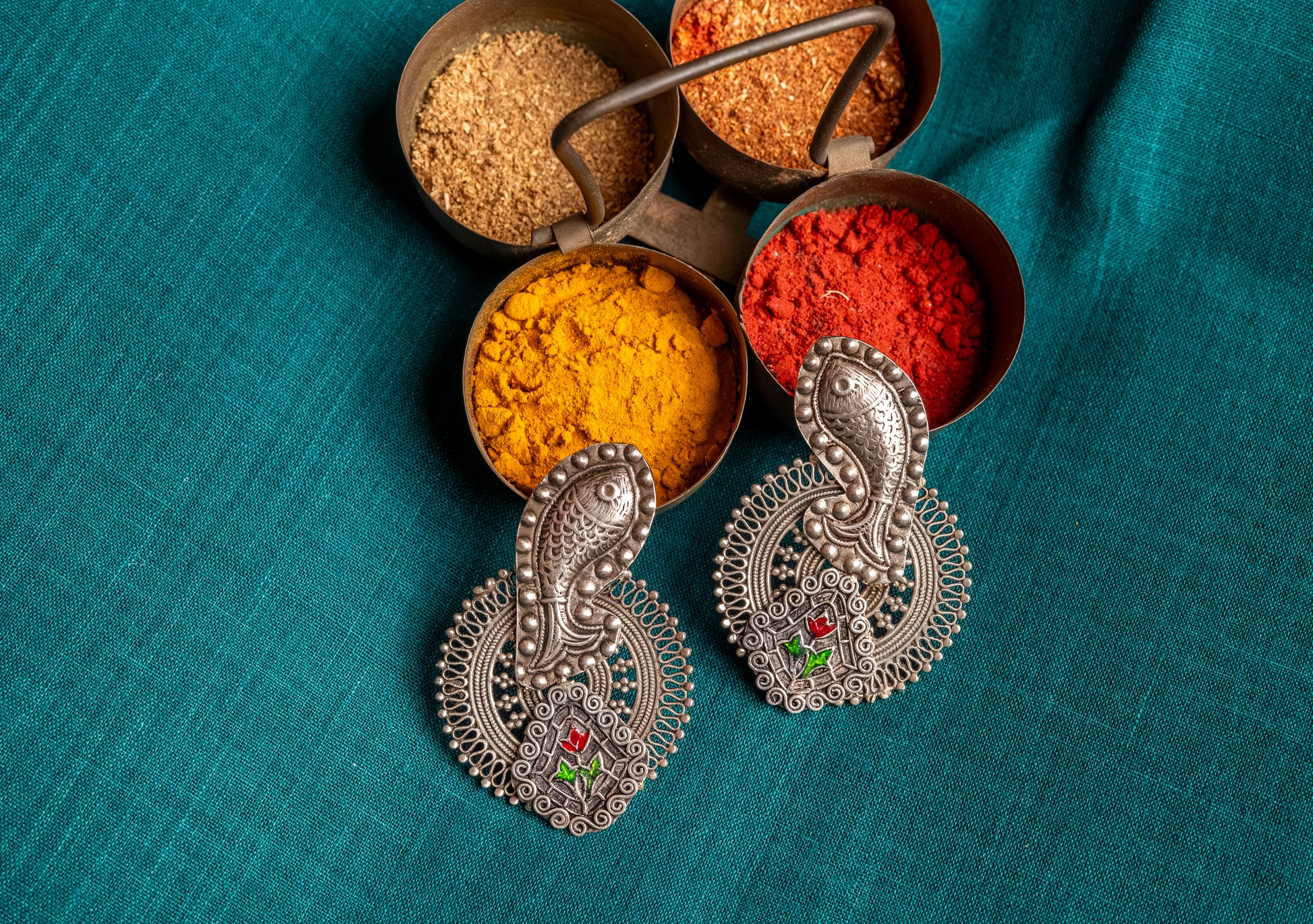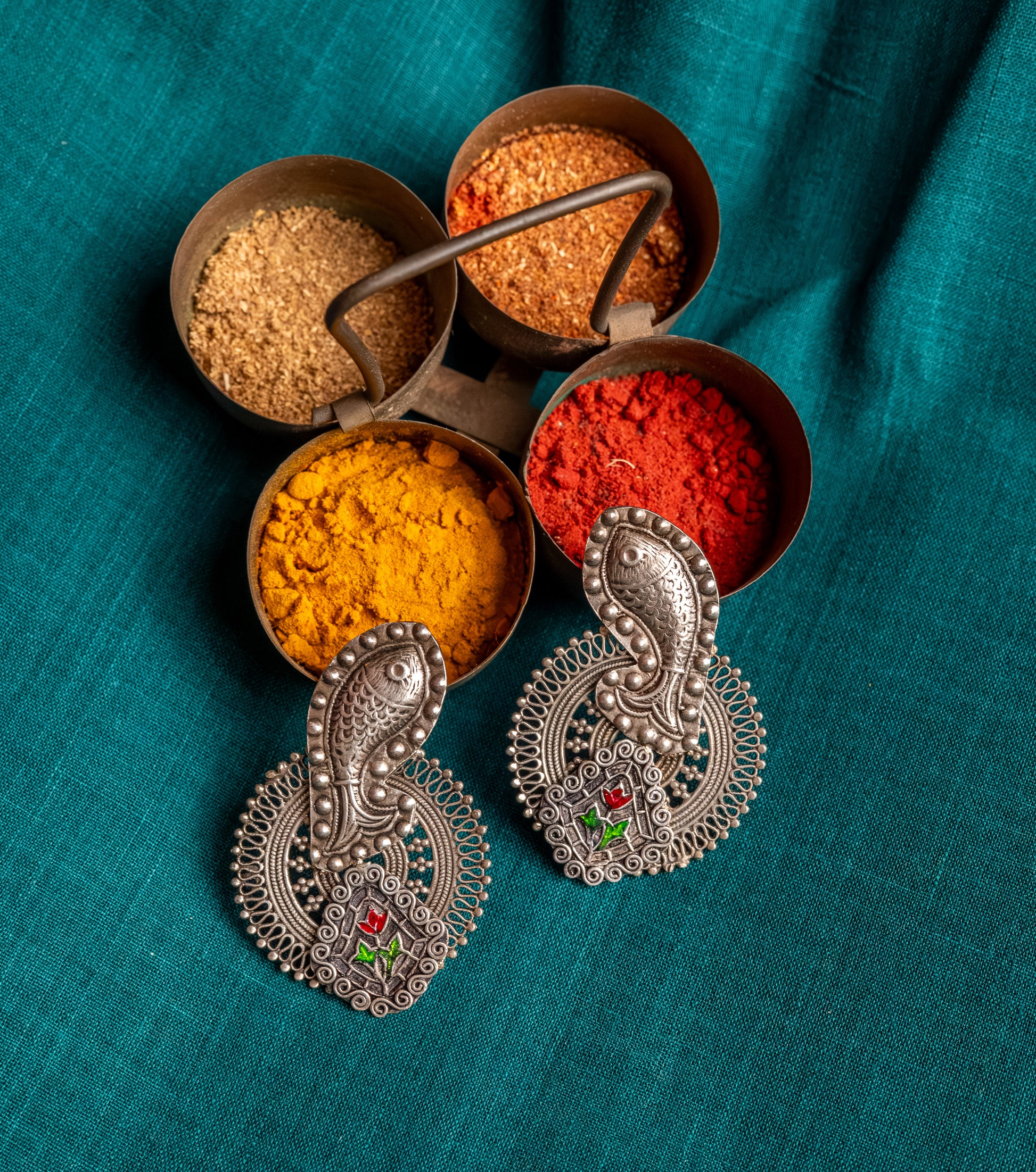 Exquisitely handcrafted large ear studs in vintage silver that depict a fish jumping out of water. The details on the fish are handbeaten and handetched which the lotus below is adorned with beautiful old style yet vibrant enamel work or meenakari. The splash of water around is represented as a halo behind the fish is extremely detailed dana work which refers to fine dot-like work in precious and semi-precious metals. Zoom in to see the details of the finesse and craftsmanship. Dimensions: Length 2 inches / 5.08 cms Breadth 1.25 inches / 3.18 cms.