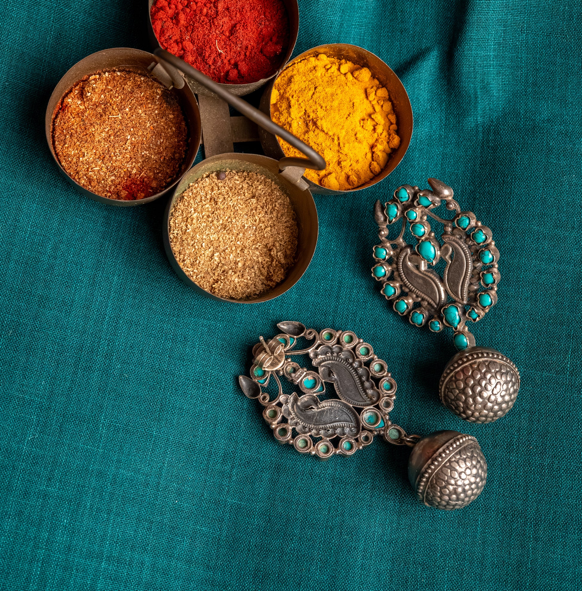 Turquoise-studded mughal-inspired earrings with solid, heavy, handcrafted borlas as danglers. The whole piece is handmade to perfection with each stone fitted manually and with precision. Dimensions: Length 3 inches / 7.62 cms Breadth 1.25 inches / 3.18 cms.